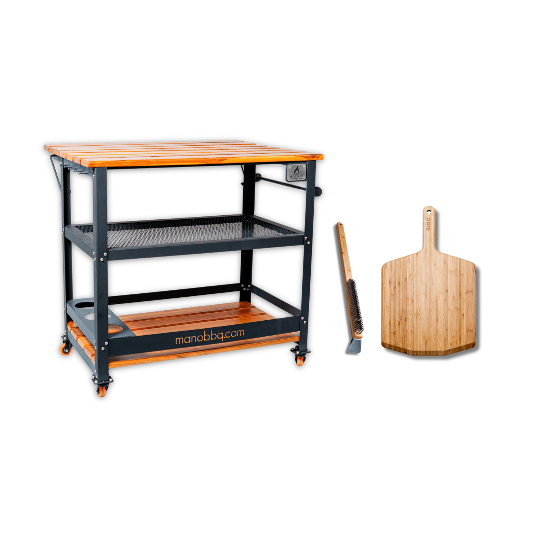 La Mesa Mano BBQ es el corazón del combo: estable, resistente y perfecta para crear un espacio de trabajo funcional en cualquier entorno. A ella se suman accesorios indispensables cómo lo son la Pala de Bambú 12″ para lanzar o servir pizzas y el Cepillo de Limpieza Ooni para mantener la piedra limpia.